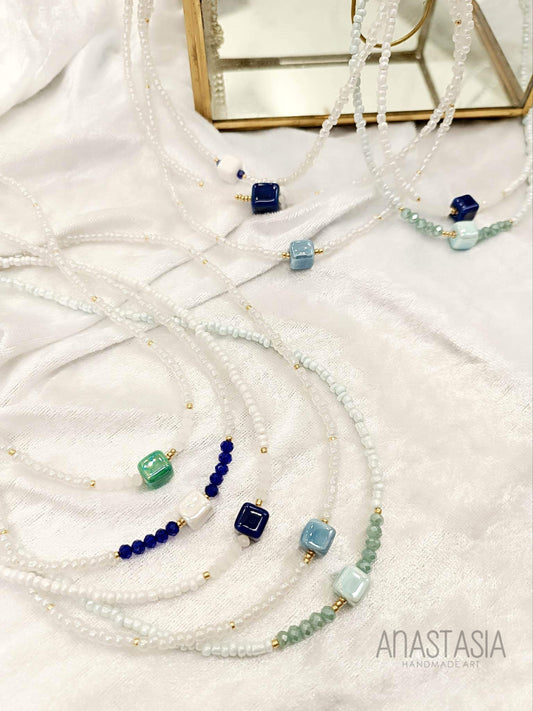 Necklace with white beads and blue stone charm