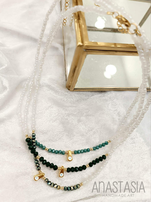 Necklace with white beads and green stone charm